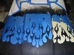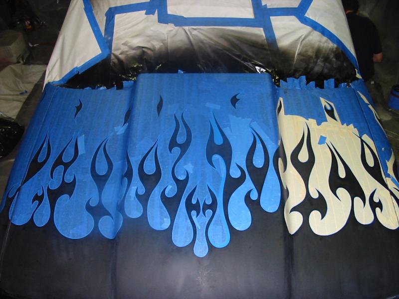 Shaved doors,antenna, hood pissers, full skin in back w/ 2 14" LED lights. Painted black w/ corvette blue flames and silver highlights.Shaved gas door and 3rd brake light