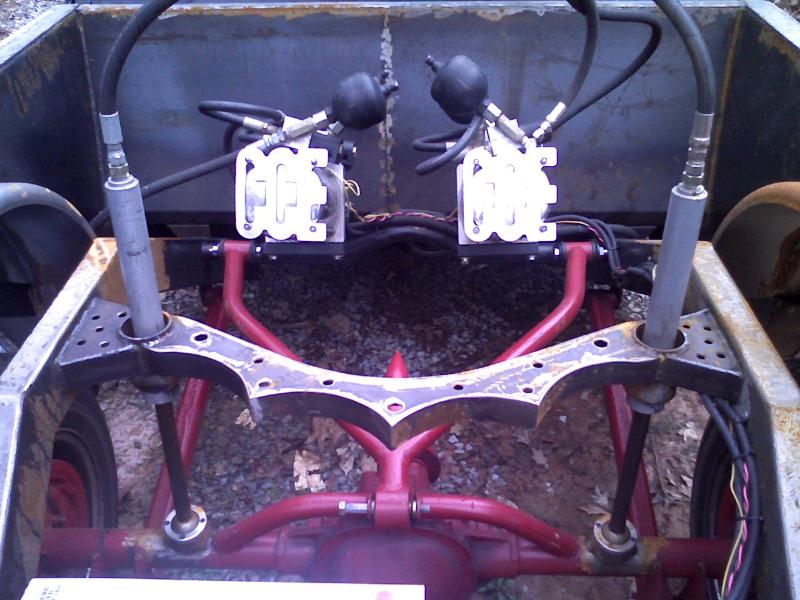 Juiced 10, 12" cylinders in the front 14" cylinders in the rear, two CCE fatboy pumps with accums, 1-off frame from firewall back, 1-off upper and lower control arms, we call the bridge batman, LOL, check it out, much props and thanks to Twist of Cain, they do badazz work when other people cant and did me well, Thanks also go to TN Jeff for the wire up on the dros.