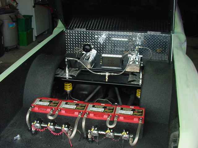 BodyDropped 4", 2 pump 2 dump prohopper hydraulic setup, all chrome pumps and dump bodies, all chrome fittings, 4 Stinger Dry Cell Deep Cycle batteries, all platinum connectors from stinger. Custom Made 4 link, maltese cross bridge plates, 6inch cylinders in front, 10inch in the back, Smoothed frame also in primer now, Frame is now painted all up ready to go.