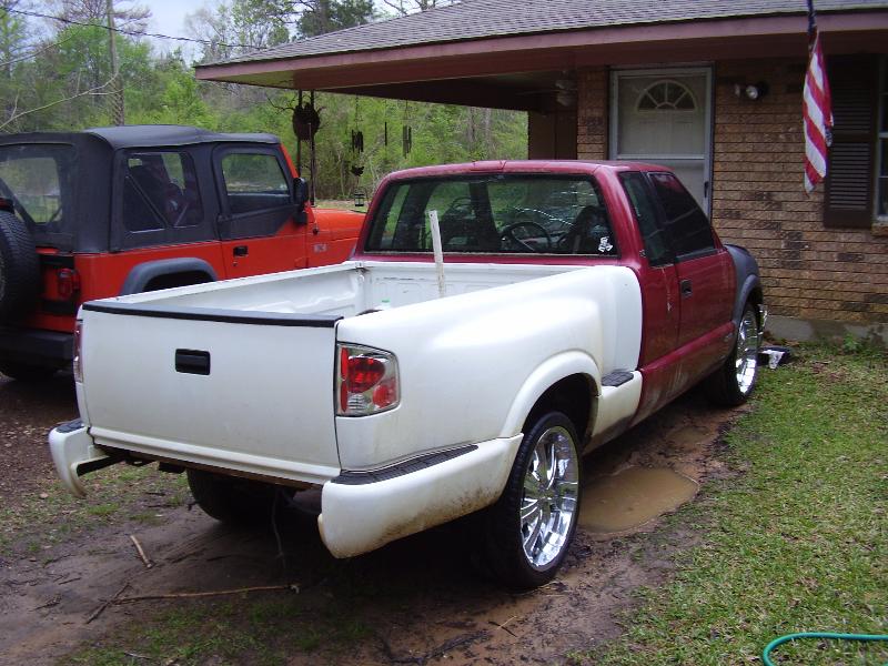 factory with hood scoop, a 1998 s-10 front clip and stepside bed.