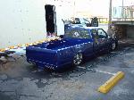 shaved everything accept gas door, shaved tailgate and roll pan with billet inserts, caddy tailights, custom front bumper, painted with a homebrewed blue paint