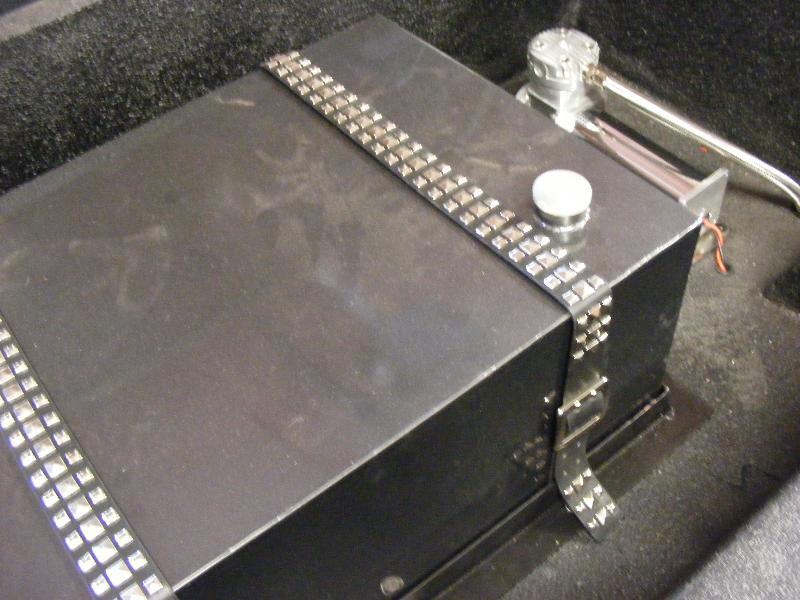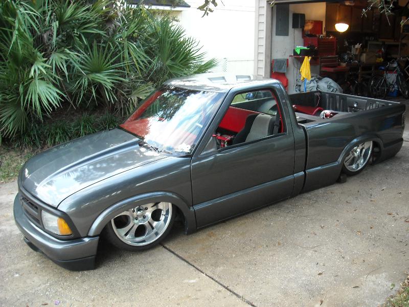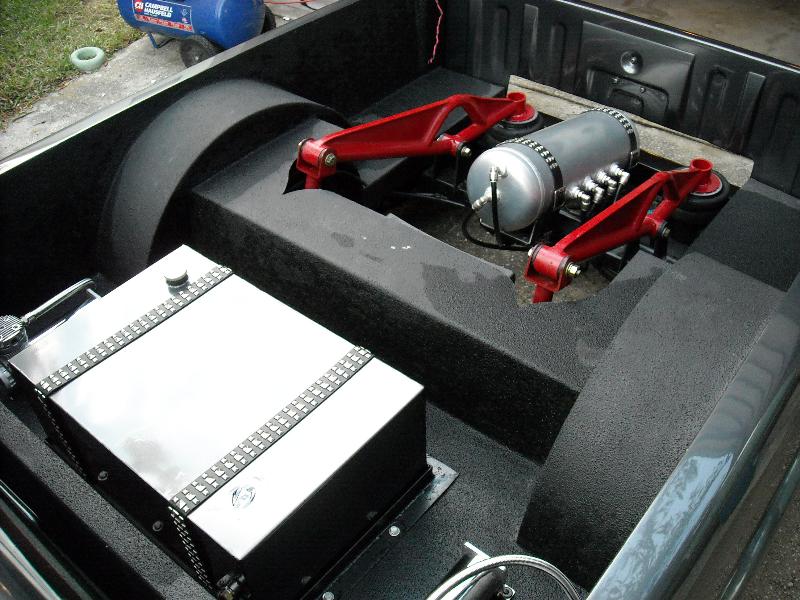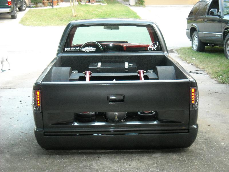 Shaved, and sprayed Dodge Dakota RT Gun Metal Grey. Tailgate has been cut and shaped to show the rear bag setup through the gate(done over 2 years ago) Bed is smothed out and houses the Seriously Insane Full cell and to Viairs