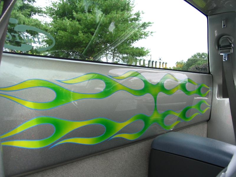 PPG Sparkle Aluminum with a Prizmatic Flake, Flamboyance Yellow and Radiance Green flames, Outlined in a Bright and Blod Blue, and Old Skool Pin Striping. Shaved Door Handles, Tail Gate Handle, Cab Seams, Bed Seams, Gas Door, Antenna, Hood Squirters, 3rd Break Light, 96 Cadillac DeVille Tail Lights, Molded Sir Michaels Roll Pan, Custom Wheel Tubs, and Rhino Lining Spray on Bed Liner.