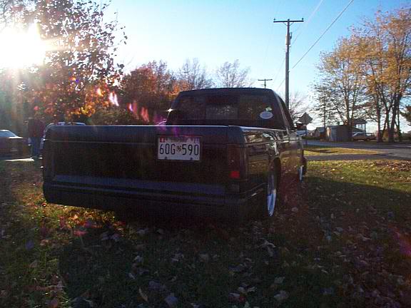 Mercedes Black, spots of primer, shaved door handels, molded roll pan, shaved emblems, shaved tailgate to body molded angled license box in tailgate, toyota 4wd chrome bumper and painted valance ,with a custom cut billet