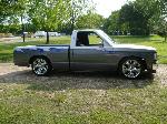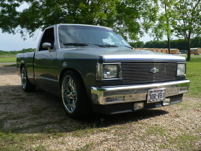 1992 Chevy s-10 pickup with a 1988 s-10 pickup front clip, after market chrome bumper, clear parking and marker lights (L.E.D), billet grill with billet s-10 emblem, lower valance after market fog lamps modified. Finders body line shaved/molded, windshield cowl and window squirts shaved/molded. After market modified shaved/molded mirrors replaced with 1968 Camaro mirrors, shaved/molded doors body line shaved/molded. Body lines shaved/molded, After market filler plates (replacing the factory tail lights), tail gate skin, roll pan, all shaved/molded into truck bed structure. License plate box shaved/molded into tailgate skin. In roll pan Cadillac tail light buckets and lights shaved/molded into truck bed structure. Lebraa vinyl bed cover Over all modified drop suspension springs and block-leaf spring with after market air shocks. 18 inch wheels chrome Panthers. Custom paint three tone light silver, dark gray, blue tribal flame.