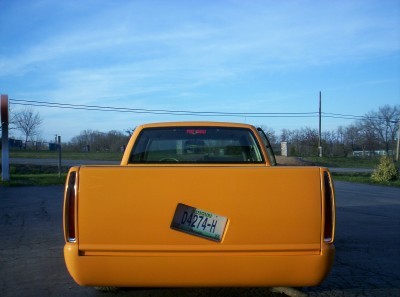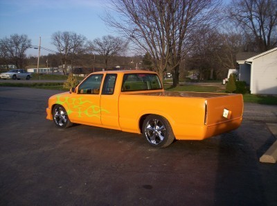 custom orange/with lime green ghost tribal flames, 18in rims, Cadillac Frenched tail lights, shaved door handles, shaved tailgate and rollpan, shaved gas door, billet grill, street scene front bumper, custom mirrors