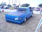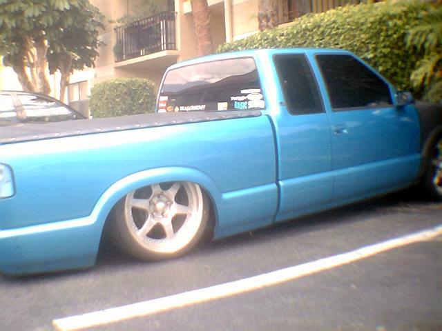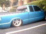Stock Chevy Bahama blue, color matched door handles, frenched tag box, full skin combo, shaved: antenna,tailgate handle, hood pissers, gas door, 3rd brake light, 03 front end, billet grille, street scene bumper cover, ram air hood w/ 2" cowl, street scene cal vu mirrors
