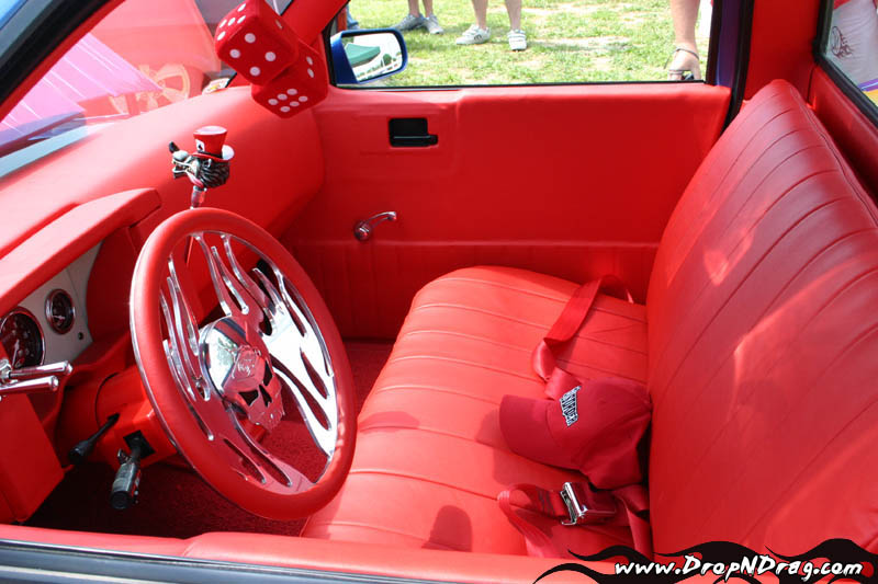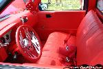 Flame Red UltraLeather stitched by me. B.A.D. Steering Wheel. So-Cal Speed shop gauges. Lokar shifter.