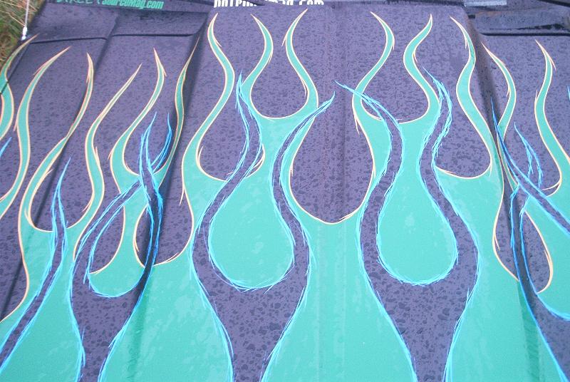 Satan Black With Green Flames With Blue and Yellow Pinstripes With Suicide Doors Completely Shaved... Motor Cycle Mirrors