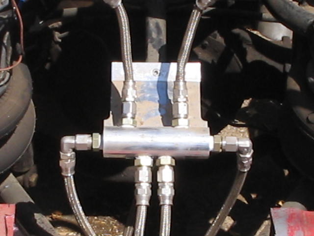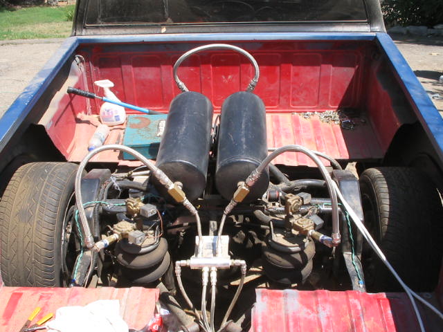 custom 4 link done by myself, custom plumbing block for the tanks, stainless steel aircraft line through the whole truck, 8 valves, 2 3 gallon tanks, 4 little compressors, bottle