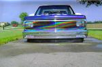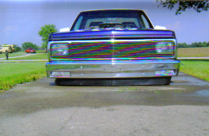 Everything shaved except taillights, 5 inch body drop, phantom billet grille, painted white with some really nasty looking flames.