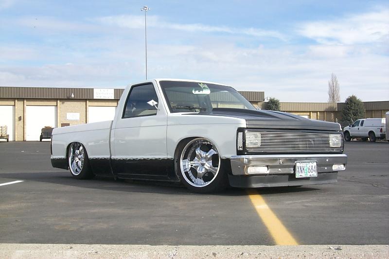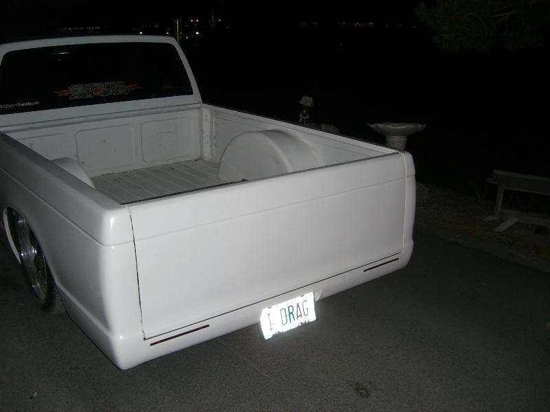 white with black rocker panels, roll pan, shaved wiper cowl, shaved door handles, shaved antenna hole, phantom grill, chrome smoothie front bumper, euro bumper and corner marker lights, cowl hood, valance, chrome diamond mirrors, custom mirror filler panels made out of bug sheet metal, shaved molding, bed cut out for c notch, cab notched for driveshaft clearance, custom flame graphics, diamond projector headlights, rear tubs, shaved squirters, shaved tailgate, shaved tail lights, 10" led strips frenched into the roll pan, tailgate handle flip kit, chrome mazda b2200 tailgate handle, billet rear license plate frame, personalize plates "I DRAG", 3" body drop, shaved firewall, suicide doors, sheet metal bed, shaved gas door, flush mount pop up gas cap