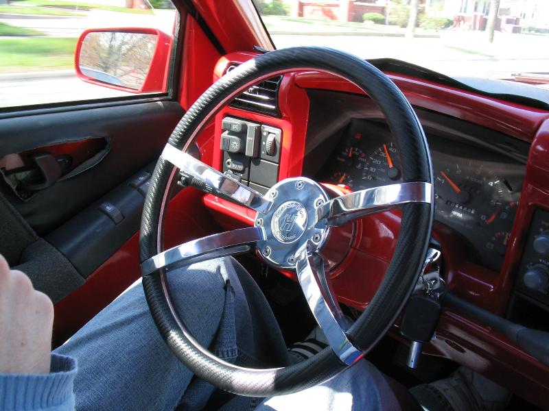 Lots of red paint. All texture has been removed from peices. Custom Billet steering wheel. New Black carpet. Origionally the truck had grey interior. the only grey peice now is the seat belts and the seats.