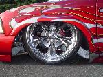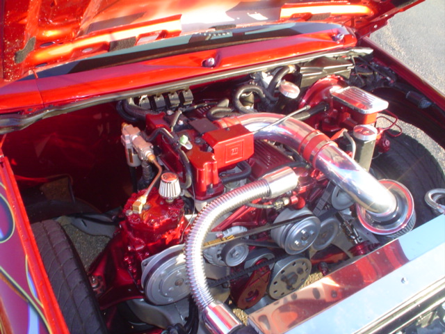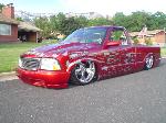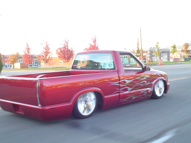 Shaved everything, Suicide doors, sheet metal bed, caddy tails, hand fabricated 2" cowl hood, 98 Sonoma front end swap R-M Carrizma Candy Apple Red paint with lots of flames.