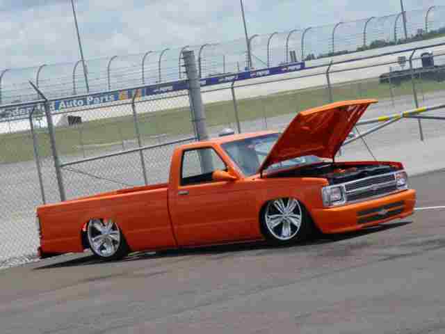 Custom Toyota front bumper, functional ram-air hood, shaved emblems, Bright Tangerine paint, Sport mirrors, Billet grilles and billet bow-ties,shaved handles & mirrors, suicide doors