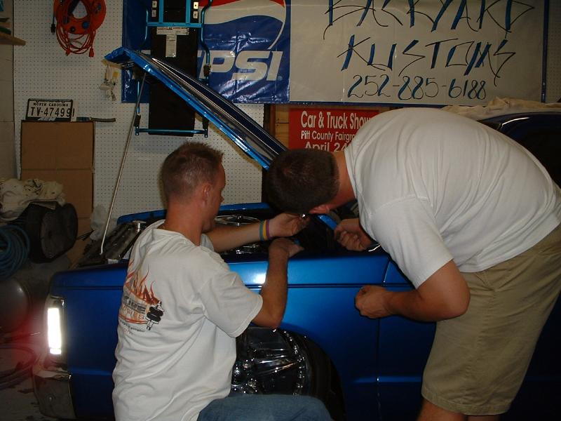 Debadged, shaved tailgate handle, molded rollpan, frenched antenna, phantom grille, smoothe chrome bumper w/ fog lights, Arlin Ness side mirrors, Goodmark cowl induction hood