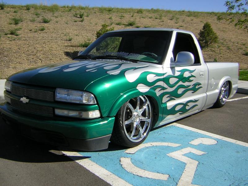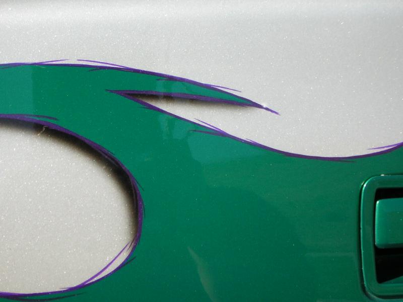 Flamed, shaved antenna, hood squirters, and molded rear pan. Rear tubbed for 22's, but decided against it cuz it looks gay