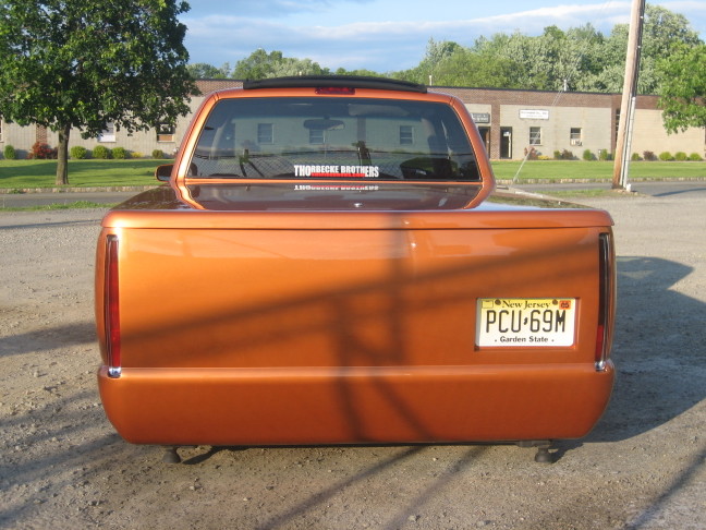 shaved door handles, antenna, taillights, hood squirters and rear bumper. 95 front end conversion w/ chrome phantom grille and chrome 98+ bumper. 35x35 sliding ragtop. full tailgarte skin, cadillac tails. billet 3rd brakelight. cirvinis hood, gaylords tonneau. painted landrover burnt orange pearl.