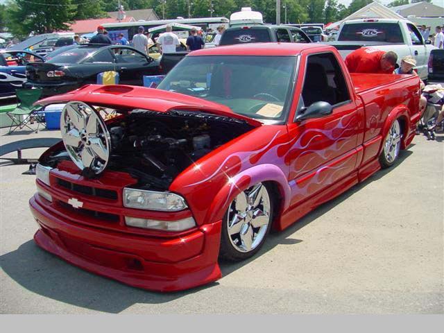shaved handles, taillights,3rd brakelight, tailgate handle, frenched liscense box, welded rollpan, ram-air hood, billet grille, extreme kit. repainted liberty red with blue pearl flames(yes red+blue pearl makes...barney purple a horrible combo but it grows on ya!)