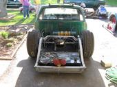2.2 four banger, custom cut and shortened intake manifold, cold air intake, electric fans, deleted abs brakes. wheel tubs removed heat/ac,removed computer, fuse block, to cab tubbed fire wall