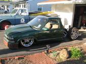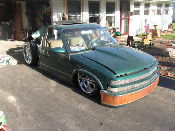 stockfloor bodydrop, Bagged 2600 front air ride upper & lower control arms 2800 back 1/2 air line ,2/Viair 380 3/8 electric valves tube frame 4 linked, 20" lift in the rear, custom fuel cell cavalier 2.2 fuel pump in tank, shorted drive shaft off extended cab,frame painted silver metallic,rearend and four link bars are gloss black