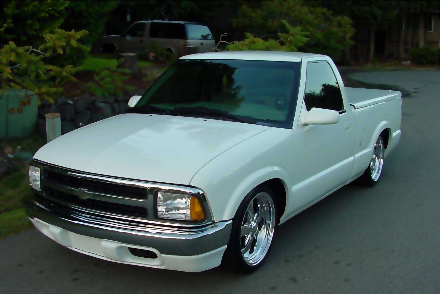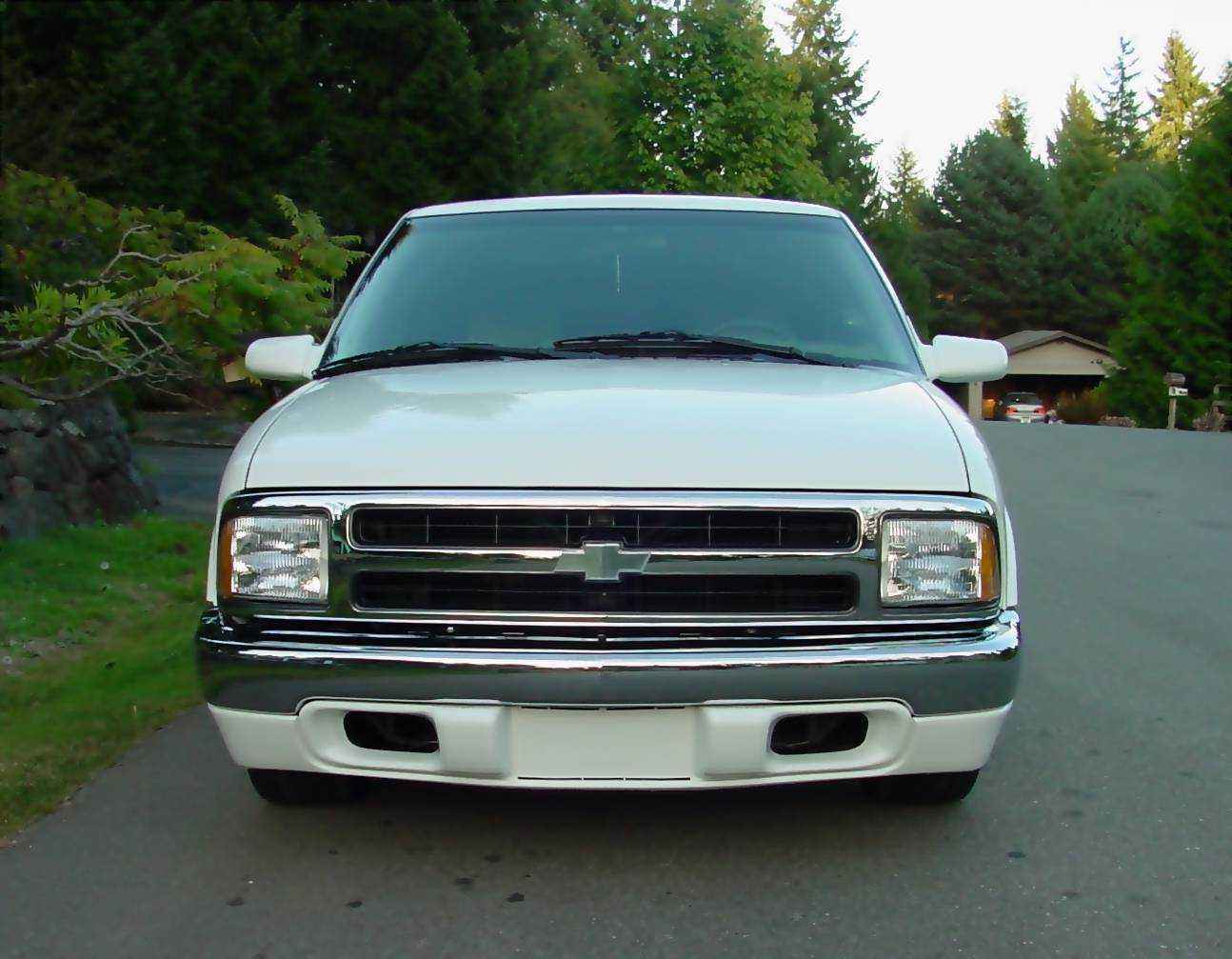 97 blazer composite headlights and chrome grille, billet emblem, 2000 s-10 chrome front bumper and painted airdamn, relocated stock bumper turn signals and mounted on the front framerails, PIAA foglights, sshaved antenna and tailgate with relocator kit, Street Scene mirrors, altezzas (i know they are played out, but clears are just asking for trouble), Stockland tonneau cover w/carpet kit in bed, rollpan