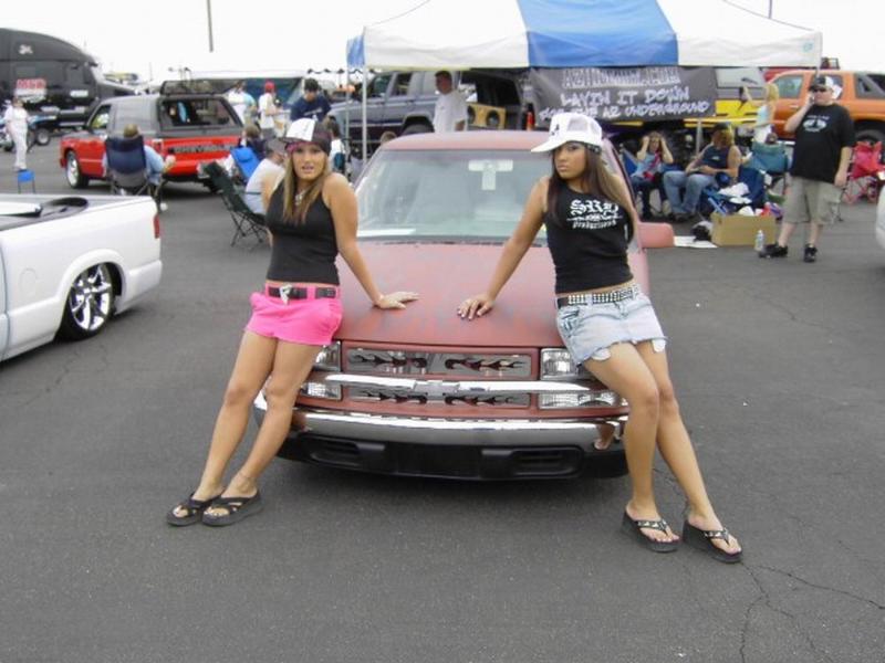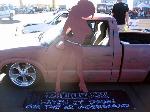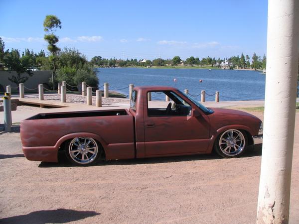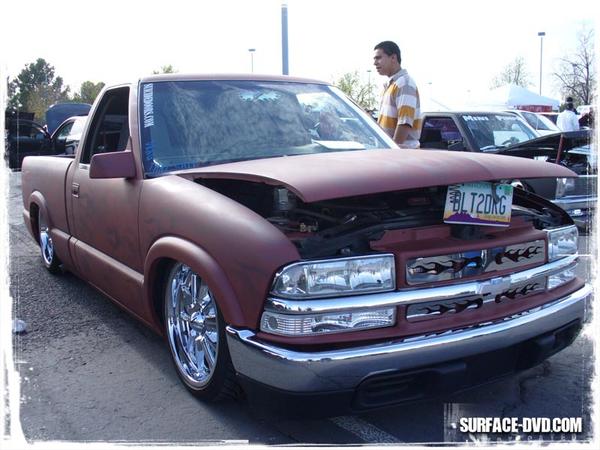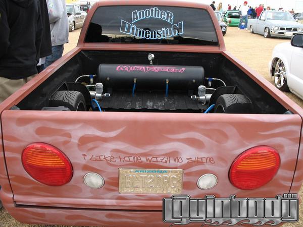 Rockin flamed Primer, 98+ front end, MIC Fast Flames, TYC clear headlights and turn signals, Billet bowtie, relocated tailgate handle, Molded Steel FBI rollpan, shaved tails, 99 VW beetle lights, shaved 3rd brake light, Shaved Antenna & shaved bed seams.