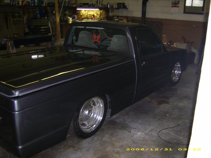 Fiberglassed dash with autometer gauges, head unit, LCD screen and DVD player. 99 S10 bucket seats, fiberglassed subwoofer box molded to back wall of cab.