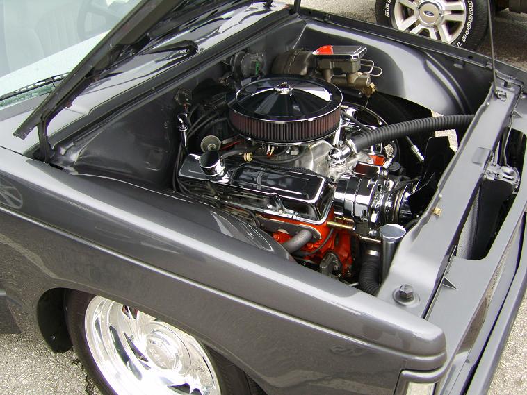 Small block chevy 350. TH350 transmission. Lots of chrome and polished aluminum.