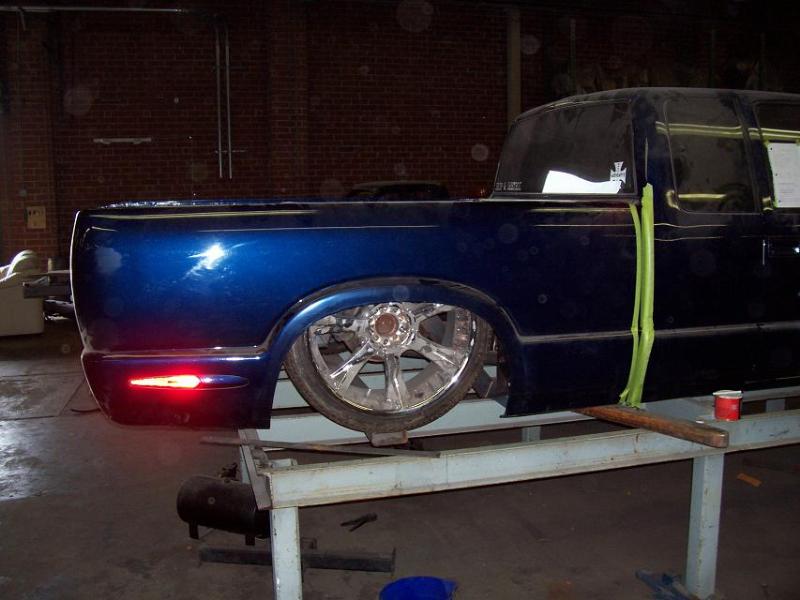 Fast bagged 1/2" elec valves, 5/8" line, FB only. slam bags in front, Universal insane lift bags in rear, (old set up)Suicide Doors 3 link, custom bracket setup to clear the 22's, fed by a Blitzluft 330 comp. 5 gallon tank w/ 8 1/2" ports and nitrogen. All installed by me and my two homies!