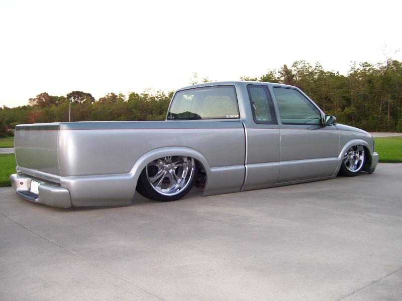 shaved doors, tailgate handle, antenna, hood pissers, tail lights, third brake light, rear bumper, sheet metal bed, and firewall