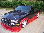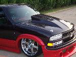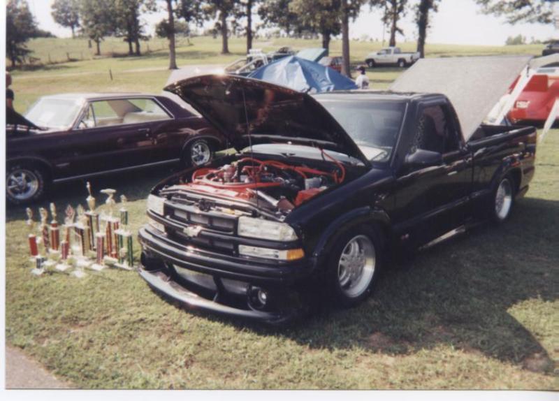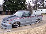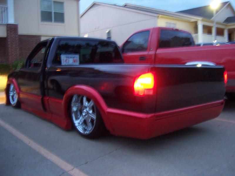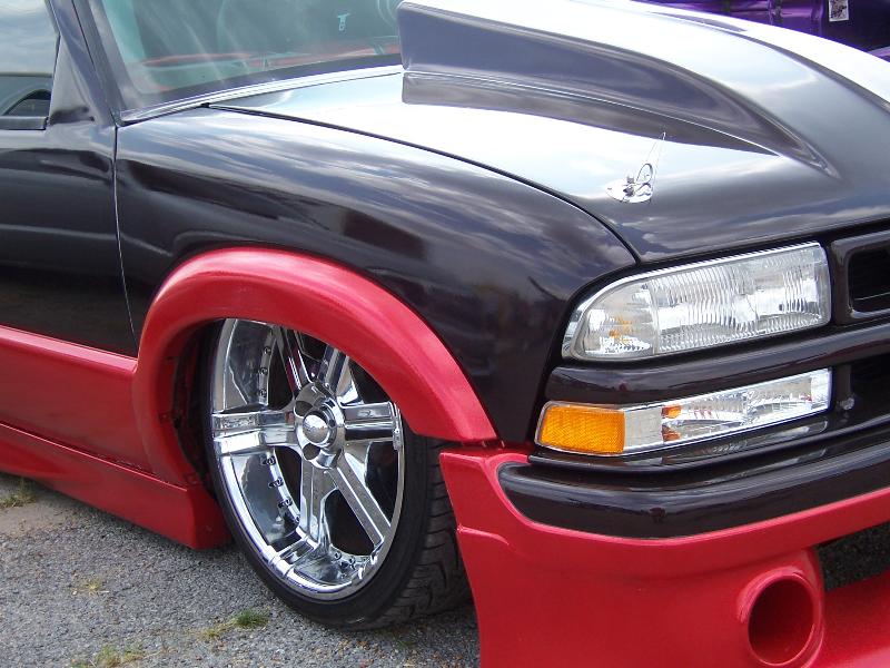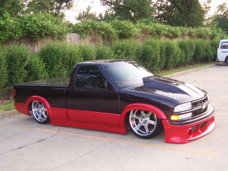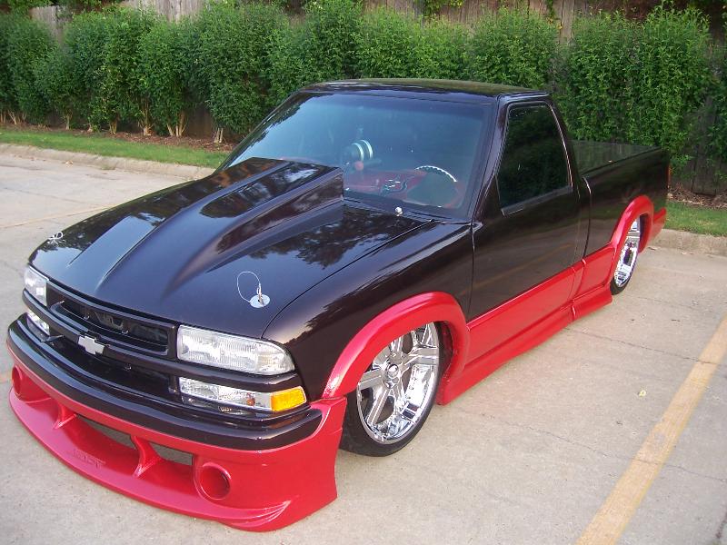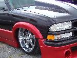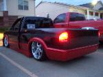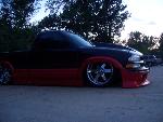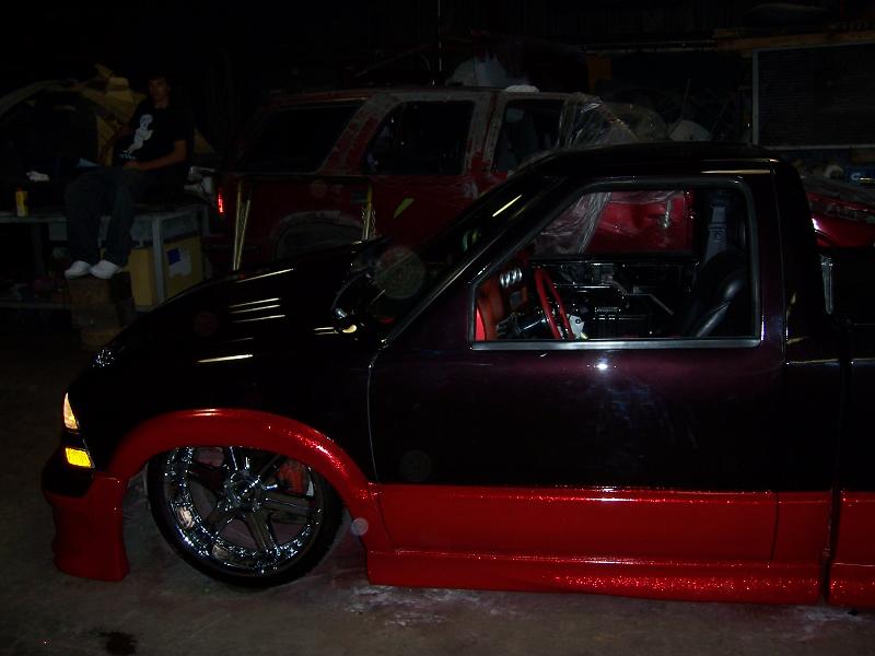 shaved mirors, door handles, squirters, fuel door, third brake light, antenna, tail gate handle, FBI rollpan, Zenon front bumper cover, UP22 4 3/4 cowl hood, smooth cowl, checker bed cover, PPG black lava red pearl on top, PPG flame red on the bottom with 6oz. of flame red Old School Flake*SOLD