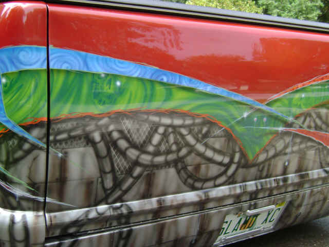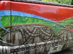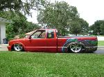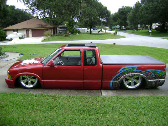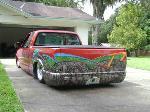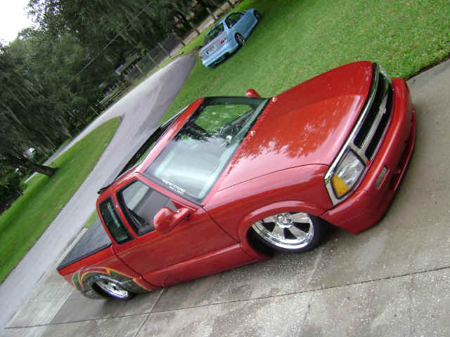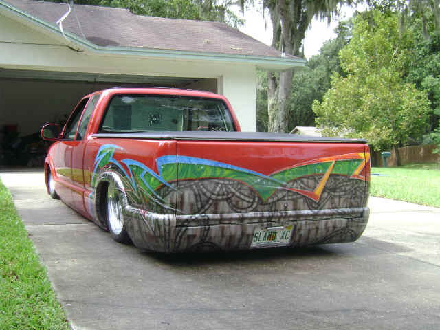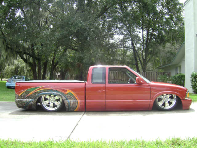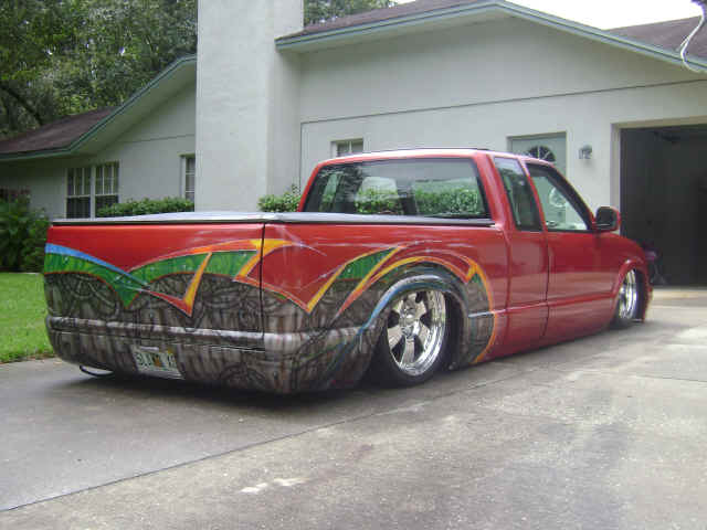 3 inch bodydrop ,shaved handles ,antenna ,hood squirters , tailights, and third brakelight, inside of bed smoothed out,96 blazer grill and headlight , 40 x 35 ragtop, along with a custom paint job