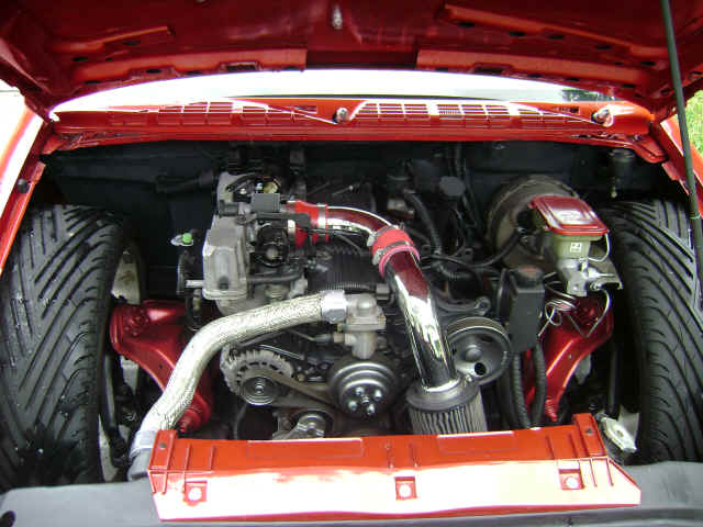 4 cylinder with a custom intake, painted upper control arms, braided hoses, smaller brake booster, and clutch master cylinder relocated for the 20's
