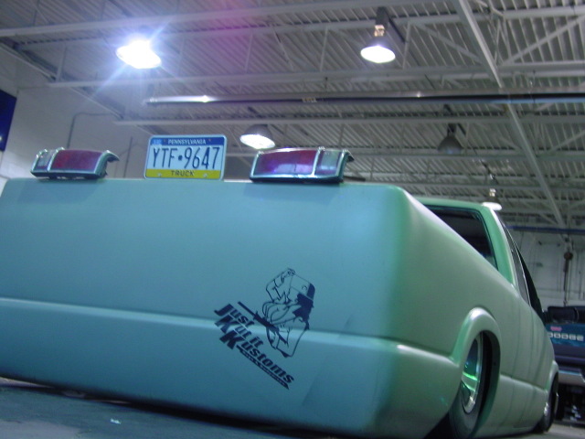 it's pink now,will be blue on bottom, think a silver color on top, and tribal spliten the 2 tone. but we got doors and front end riped apart. shaven door handles, 3rd brake, antana, washer things, rollpan, tailgate, frenched li plate, silverado tail lights
