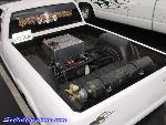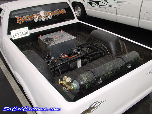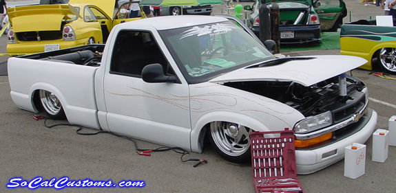 bagged on 3 switches, front left and right and rear. chrome triangulated 4 link, monoshock, 5 gal air tank under the bed but no compressor right now