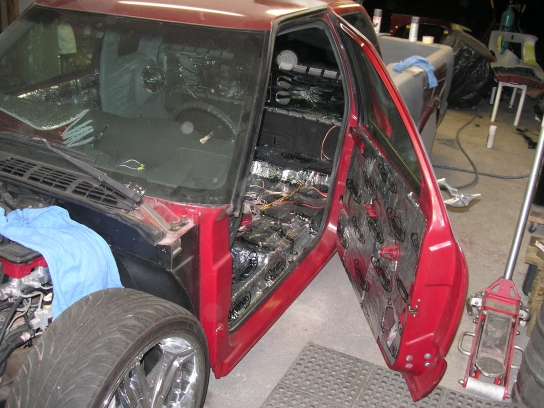 2 Audiobahn Alumapro 15" subwoofers run by 2 a2300hct amps. 4800wt's total, enclosed in a sealed fiberglass box. Mids consist of four 3 way audiobahn 5 1/2 speakers run by a 400wt audobahn a4002T amp. And a Clarion headunit