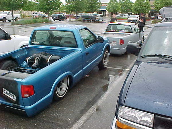 Fully custom built wishbone setup with bags on lower bars in the back. 9 gallon tank. Single slow compressor setup for now. 2b6 bags up front with Blitzluft valves