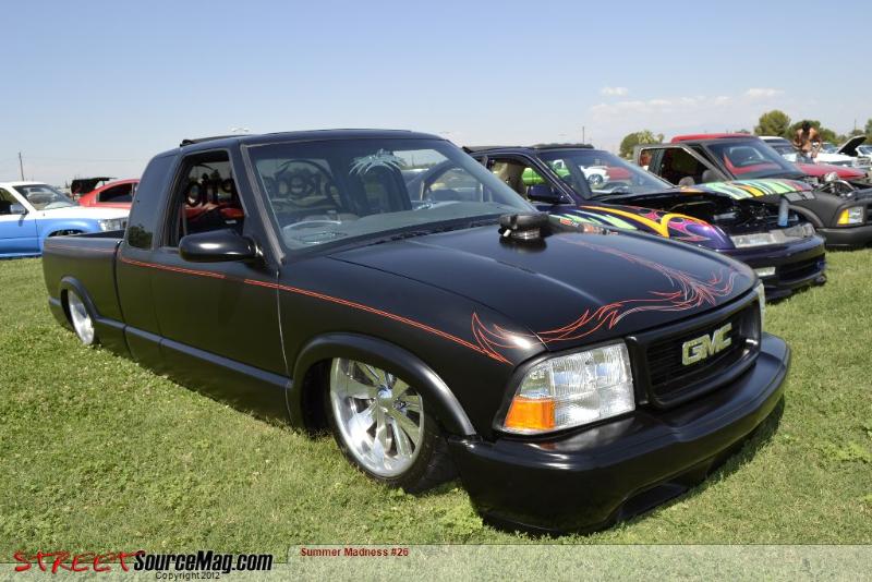 trad. body drop, shaved; doors, antenna, lights, gas door, cali combo w/ avs 11" LED lights, sheet metal bed, all done by fiction fab. Painted flat black by Kal Koncepts w/ pinstriping by Air Syndicate also painted back window by Air Syndicate.