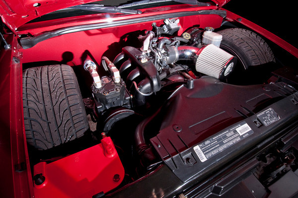 2.2 L w/ intake. Lowered engine w/ sectioned oil pan. Kept stock fan shroud. Have EDC hooked up to keep my air pumping. Shaved and tubbed firewall. Firewall sprayed w/ rubberized coating and painted to match the outside.