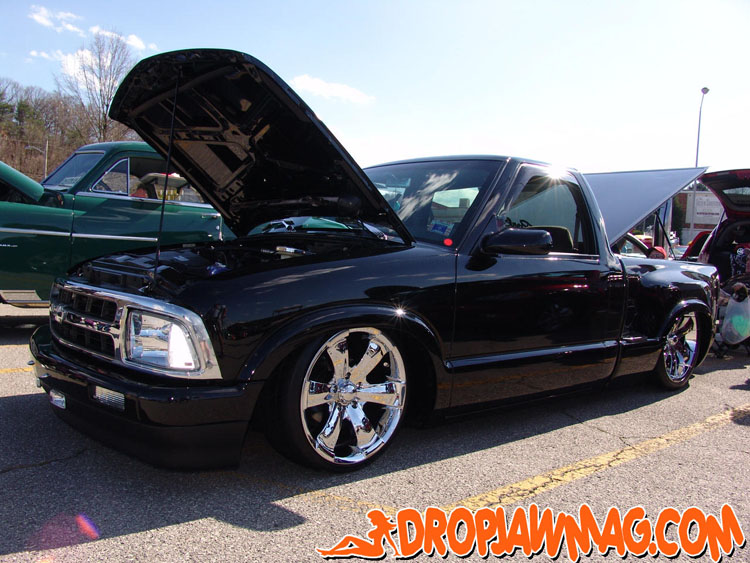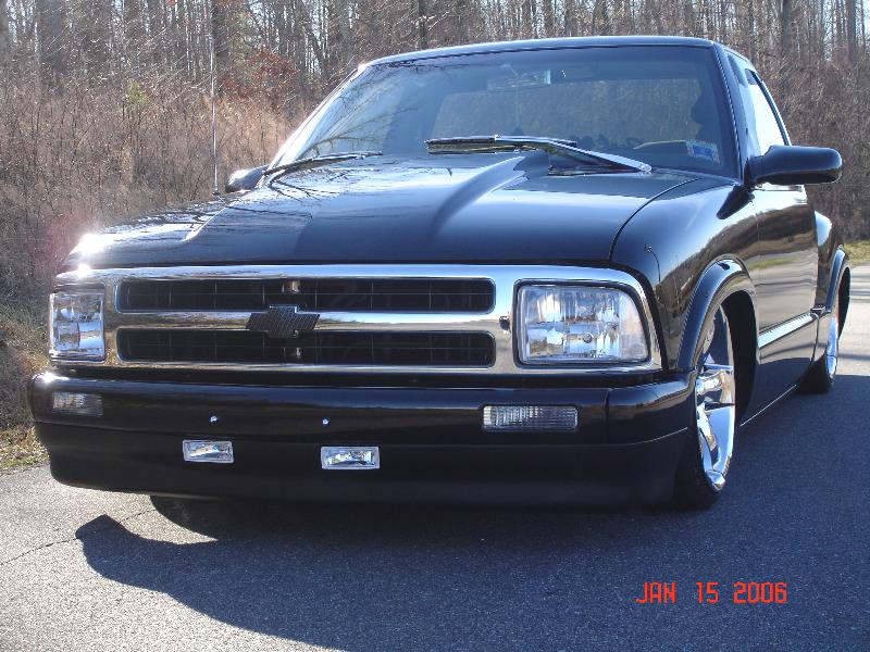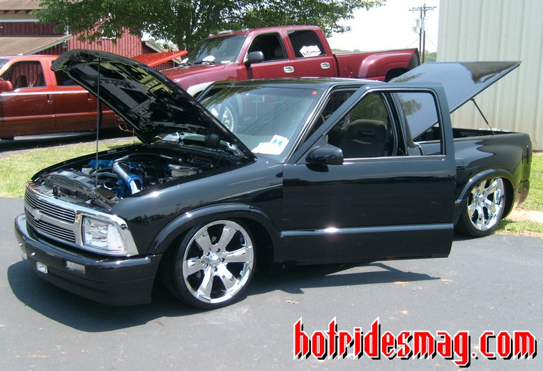 97 Blazer grille, grille inserts, 97 Blazer euro diamond clear headlights, cowl induction hood, smooth wiper cowl, billet wiper arms, street scene mirrors, shaved door handles, checkmate bed cover skinned with black powdercoated sheet metal, billet step plates, shaved and relocated tailgate handle and shaved rear steps, smoked third brake light and GTS tailight covers.