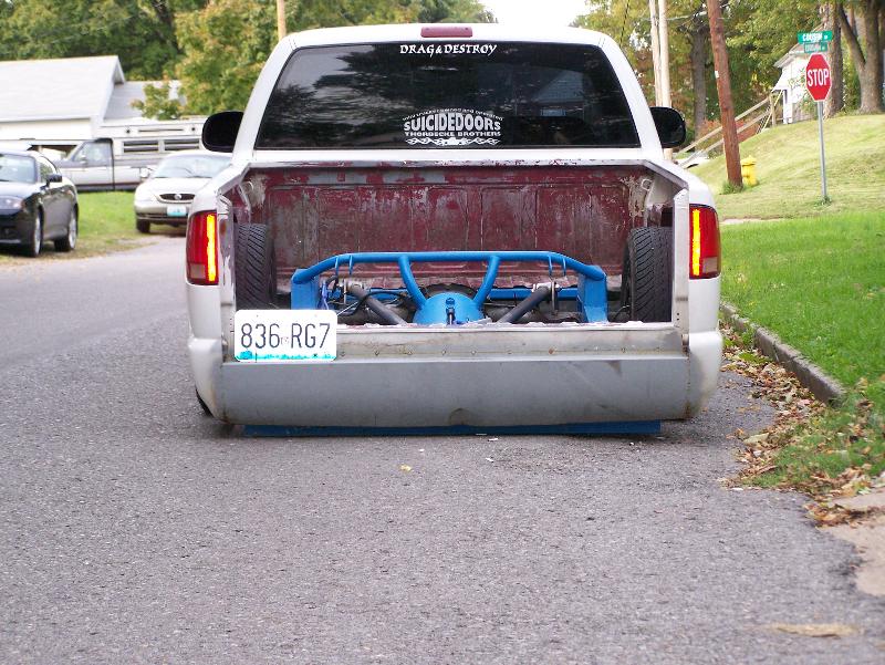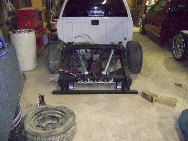 airlift 2600 bags in the back and 25's in the front, 8 1/2" airlift valves,1 450 compressor,1 5 gallon tank , custom reverse 4 link. 2 in" beltech drop spindels