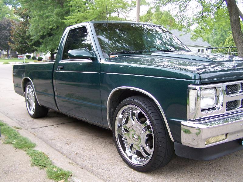 shaved tailgate, rollpan, sliding bed cover, metallic hunter green paint, imitation cowl hood,chrome grille, clear corners, chrome 93' bumper,all stock emblems and molding shaved off, sport mirrors, green neon under glow, hidden trailor hitch, flip up license plate.
