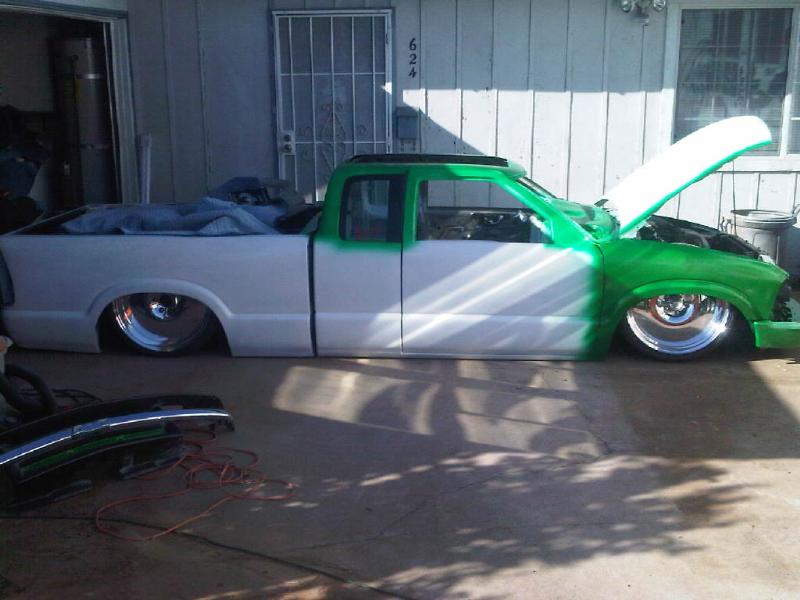 shaved handles, squirters, mirrors,3rd brake light, cali combo with colorado lights flipped upside down,38x40 electric rag, LineX bed, 3.75 inch chop