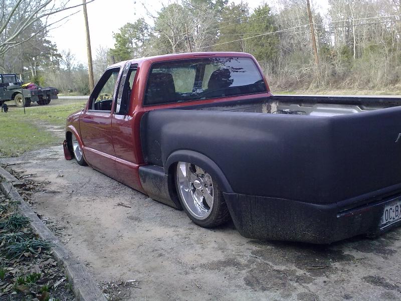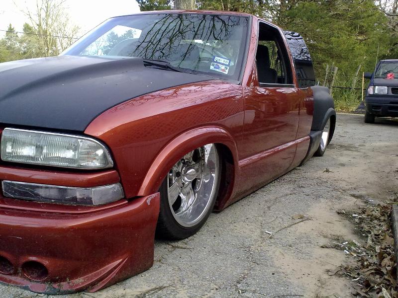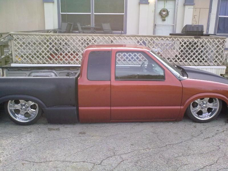 sunset orange shaved handles with door poppers,gas lid, tail lights, tail gate welded in, tail gate handle,step shaver kit for a sport side, billet grille insert reflecion cowl hood,bilet bow tie street sceen bumper cover all painted becides the bed (its under construction)