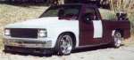 Black cherry pearl and primer. 17inch Prime 357's tucked in 215/45 and 225/40 tread. Shaved items are as follows--fenders, antenna, body moulding, emblems,door handles, rollpan, tailgate(w/license box), and cowl panel. billet grill, Pop-Up Sunroof, chrome bumper, custom cut bezels to match my shaved front corners, 3in Fiberglass cowl hood, SS Mirrors, tonneau cover, and Altezza Euro Tailights. Thinking about shaving the bodyline, welding on the rollpan, and adding some custom mirrors. IN PROCESS: Shaved front bumper, GMC grill shell with cut corners, new tailgate skin possibly welded shut.