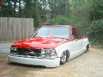 Fully shaved, with all metal steps, sheetmetal bed, and a 35x40 ragtop, painted viper red, and pearl white 2 tone with green stripe in the middle.