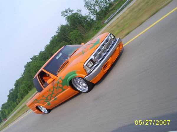 buckets out of a 2000 S-10 cover in orange and green vinal and a custom built fiberglass console and speaker box fiberglass dash door panels and headliner all other panels smoothed and painted