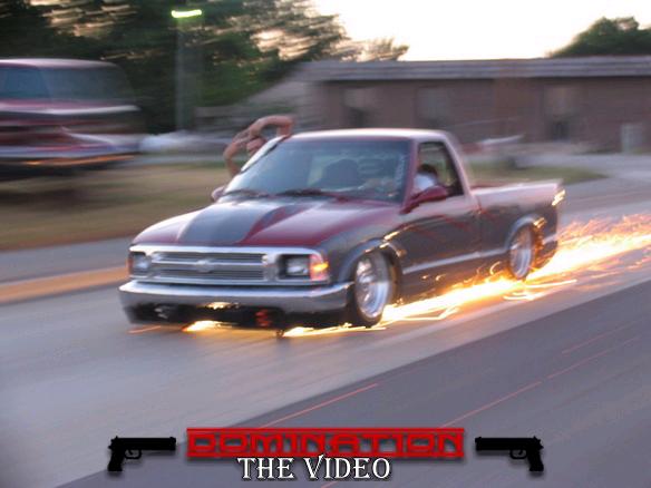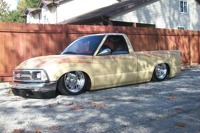 shaved every thing one off cowl hood,full sheet metal bed with small rear spoiler and led tail lights,plus a third brake light 3"body drop air accuated gas door