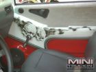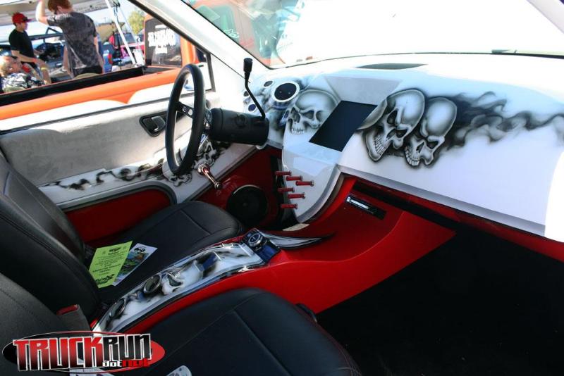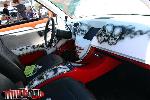 black carpet, seats are done black vinyl with red stitching, painted door panels to match the exterior, custom dash and center console painted and airbrushed to match exterior, red Dakota Digital gauges.